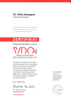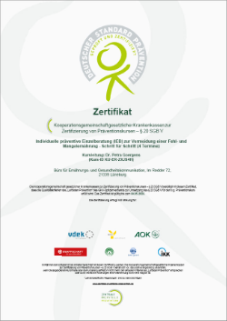 - Zertifikat für die Individuelle präventive Einzelberatung zur Vermeidung von Fehl- und Mangelernährung durch die Zentrale Prüfstelle Prävention
