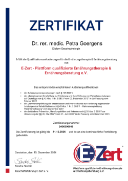 - Zertifizierte Ernährungstherapeutin durch e-Zert e.V. – Plattform qualifizierte Ernährungstherapie & Ernährungsberatung e.V.