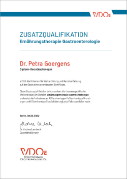 - Zertifikat über die Zusatzqualifikation Ernährungstherapie Gastroenterologie durch den Berufsverband Oecotrophologie e.V.